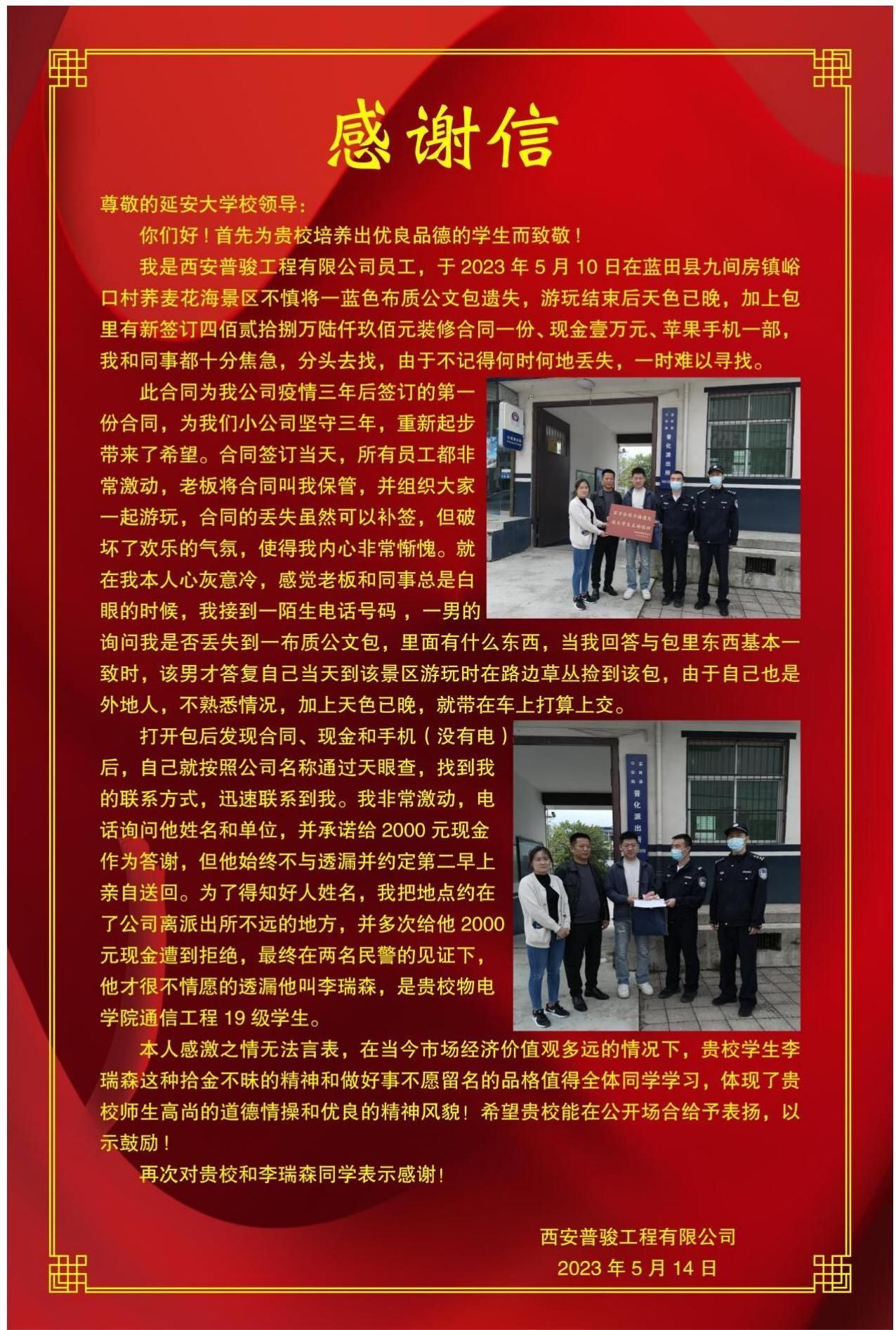 会上,全体起立奏唱中华人民共和国国歌。肖金学介绍了通信19班李瑞森同学“拾金不昧”先进事迹基本情况,宣读了公司表彰决定。张富春向李瑞森颁发了荣誉证书,常胜伟为李瑞森佩戴绶带。李瑞森在交流发言时说道:捡到东西要归失主是普通的一件小事,自己良好习惯的养成得益于优良家风中父母的言传身教,得益于母校老师的辛勤培育,特别是大学四年,在延安这片红色的沃土上,在365英国上市集团这座红色熔炉中,延安精神对自己潜移默化地滋养。同学代表杨嘉成,辅导员冯晓依次作了交流发言。袁松岩老师代表公司宣读了向李瑞森同学学习的倡议书。