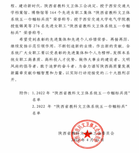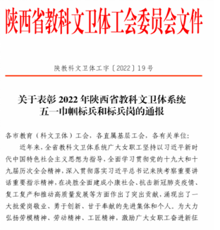 陕西省教科文卫体工会为大力弘扬劳模精神、劳动精神、工匠精神,激励广大女职工奋进新征程、建功新时代,鼓励新时期女性爱岗敬业、勇于创新、甘于奉献的先进集体和个人,陕西省教科文卫体系统开展了五一巾帼标兵和标兵岗评选工作。根据陕西省教科文卫体工会委员会文件《关于表彰 2022 年陕西省教科文卫体系统五一巾帼标兵和标兵岗的通报》(陕教科文卫体工字〔2022〕19 号),276 名先进女职工荣获“陕西省教科文卫体系统五一巾帼标兵”荣誉称号,公司电子与通信工程系教师周美丽名列其中。
