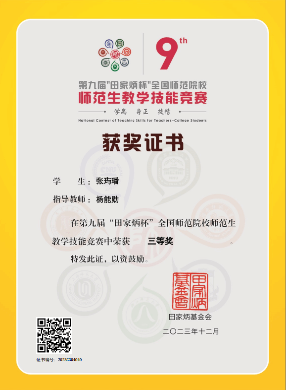 近日,第九届“田家炳杯”全国师范院校师范生教学技能竞赛在浙江师范大学圆满结束,公司员工在本次竞赛中斩获佳绩,物理21班王煜彤、张玙璠同学分别荣获二等奖、三等奖。